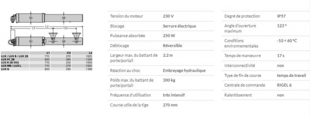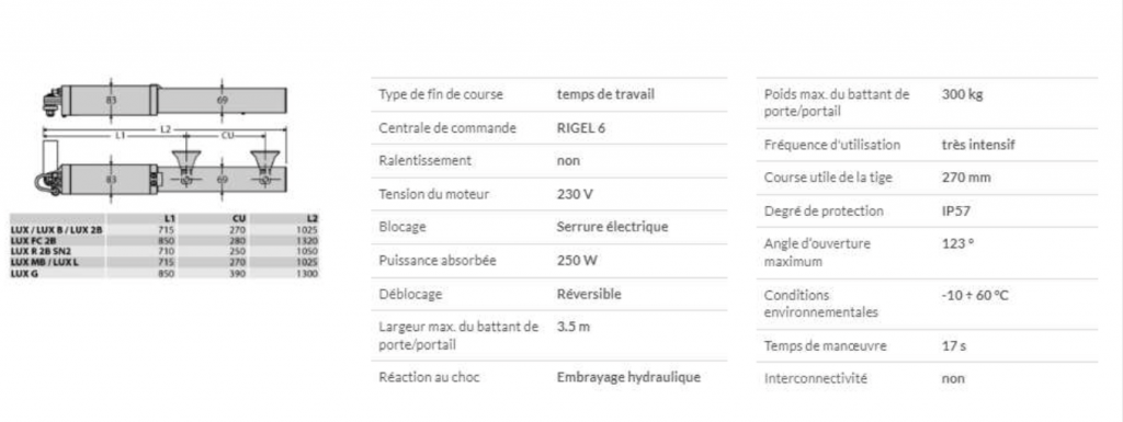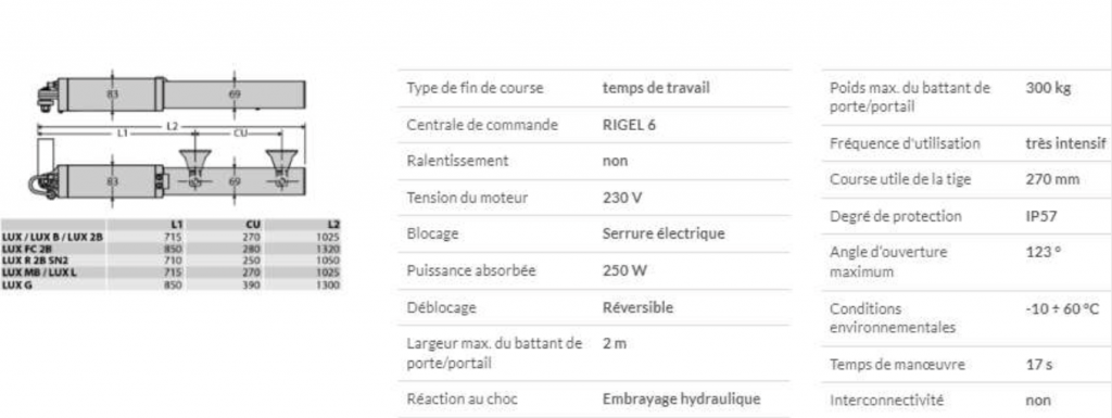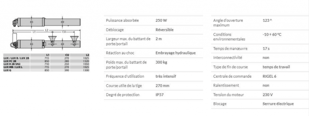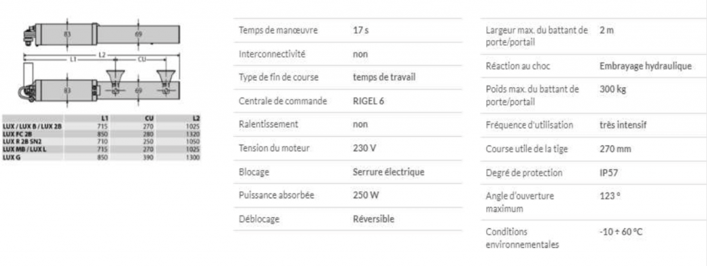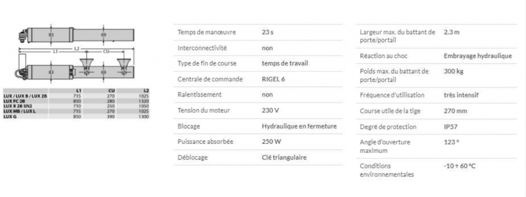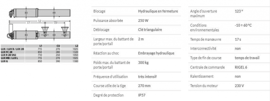 Nous proposons un opérateur hydraulique de 230 V conçu pour les portes battantes jusqu’à 2,2 mètres de large et pesant jusqu’à 300 kg. Avec une course utile de 270 mm, il offre un temps de manœuvre de 17 secondes et permet un angle maximum d’ouverture de 123 degrés.